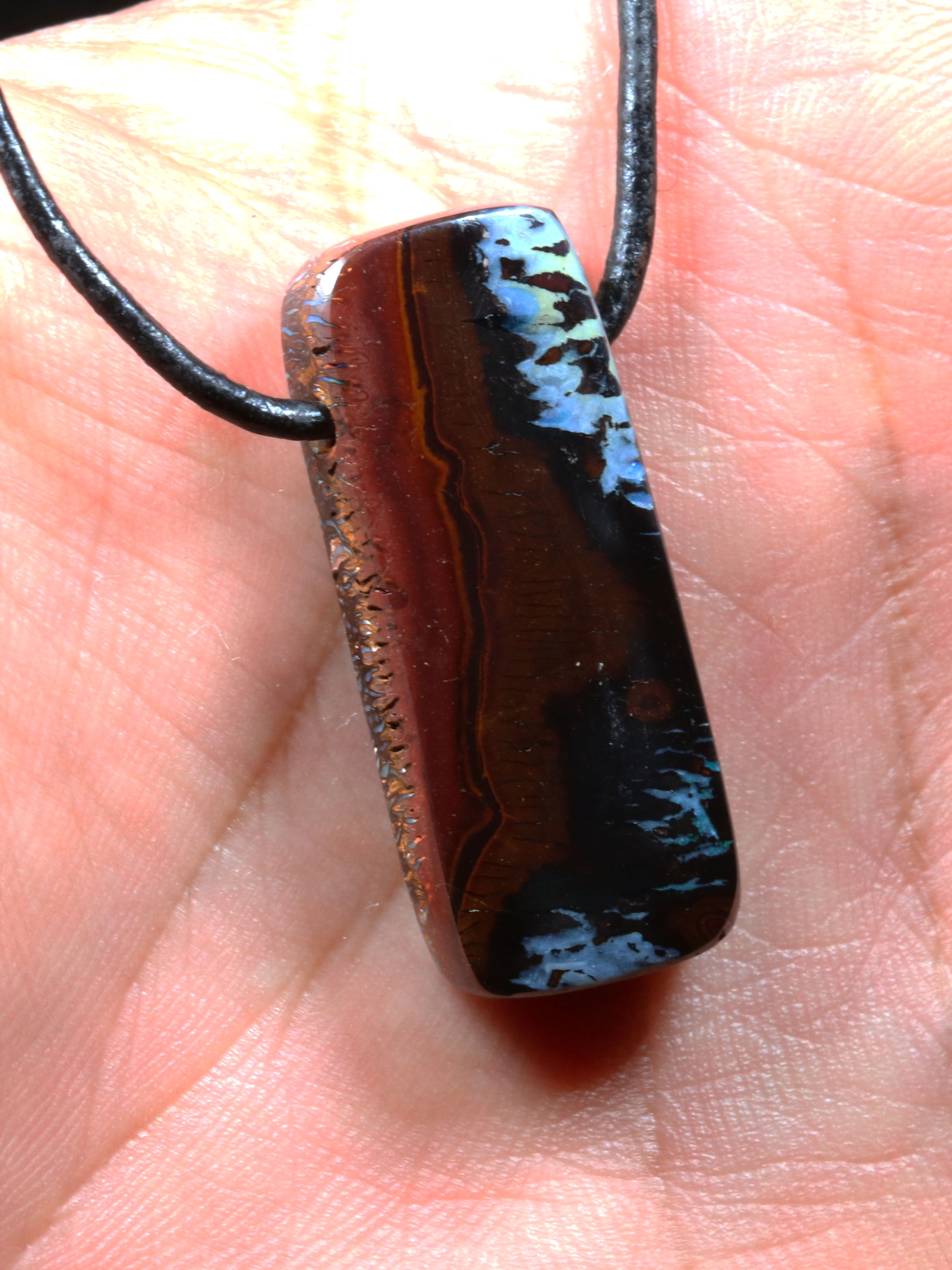 Boulder Opal Anhänger aus Australien. Gebohrt inklusive Lederband.