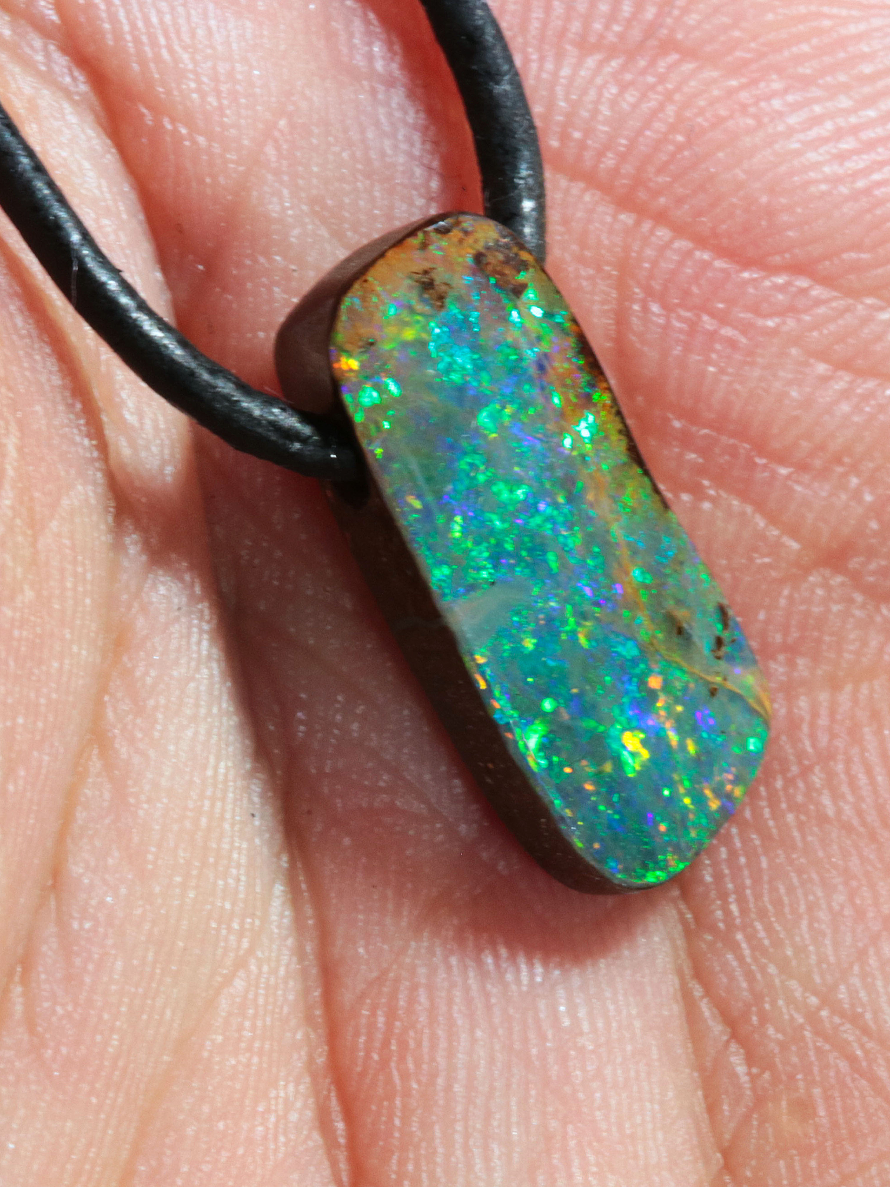 Boulder Opal Anhänger aus Australien. Gebohrt inklusive Lederband.
